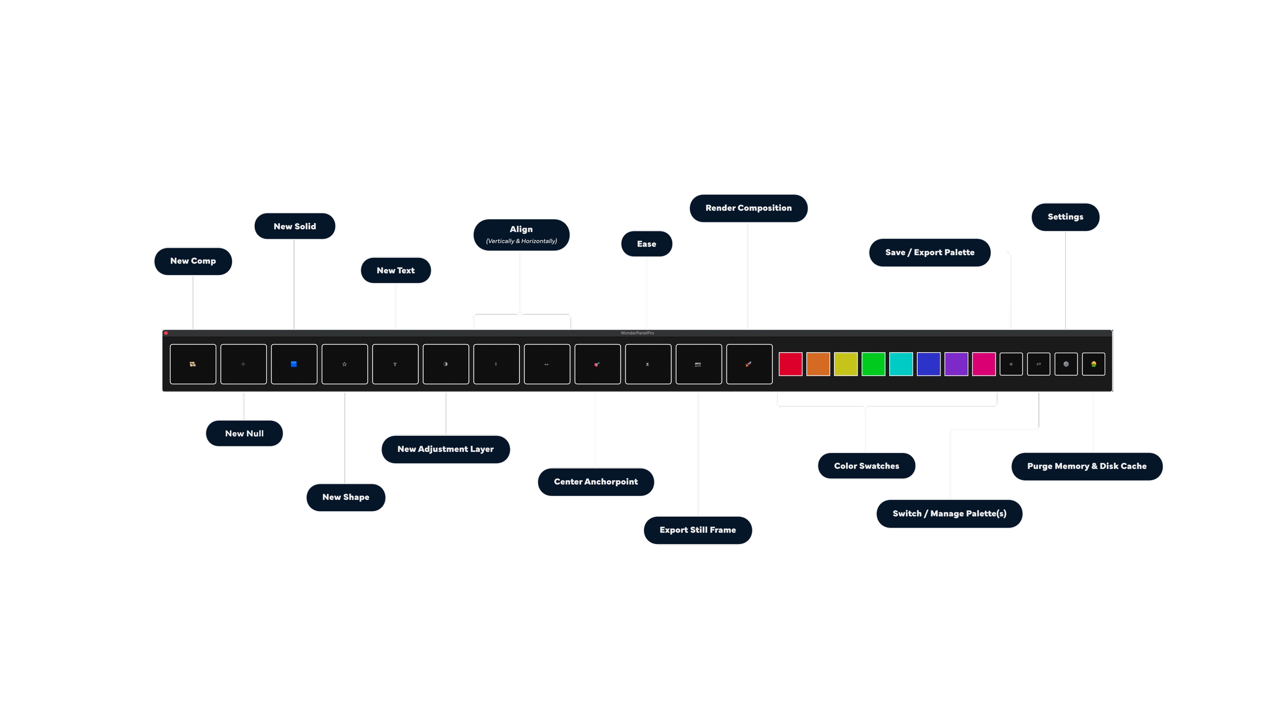 Align and distribute layers, cycle anchor point position with ease, and export frames as PNGs and import them instantly. Plus, a purge memory & disk cache button for those finer moments when AE needs to pull trig.